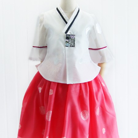 백색 나팔소매 저고리와 홍색치마가 조화로운 디자인~